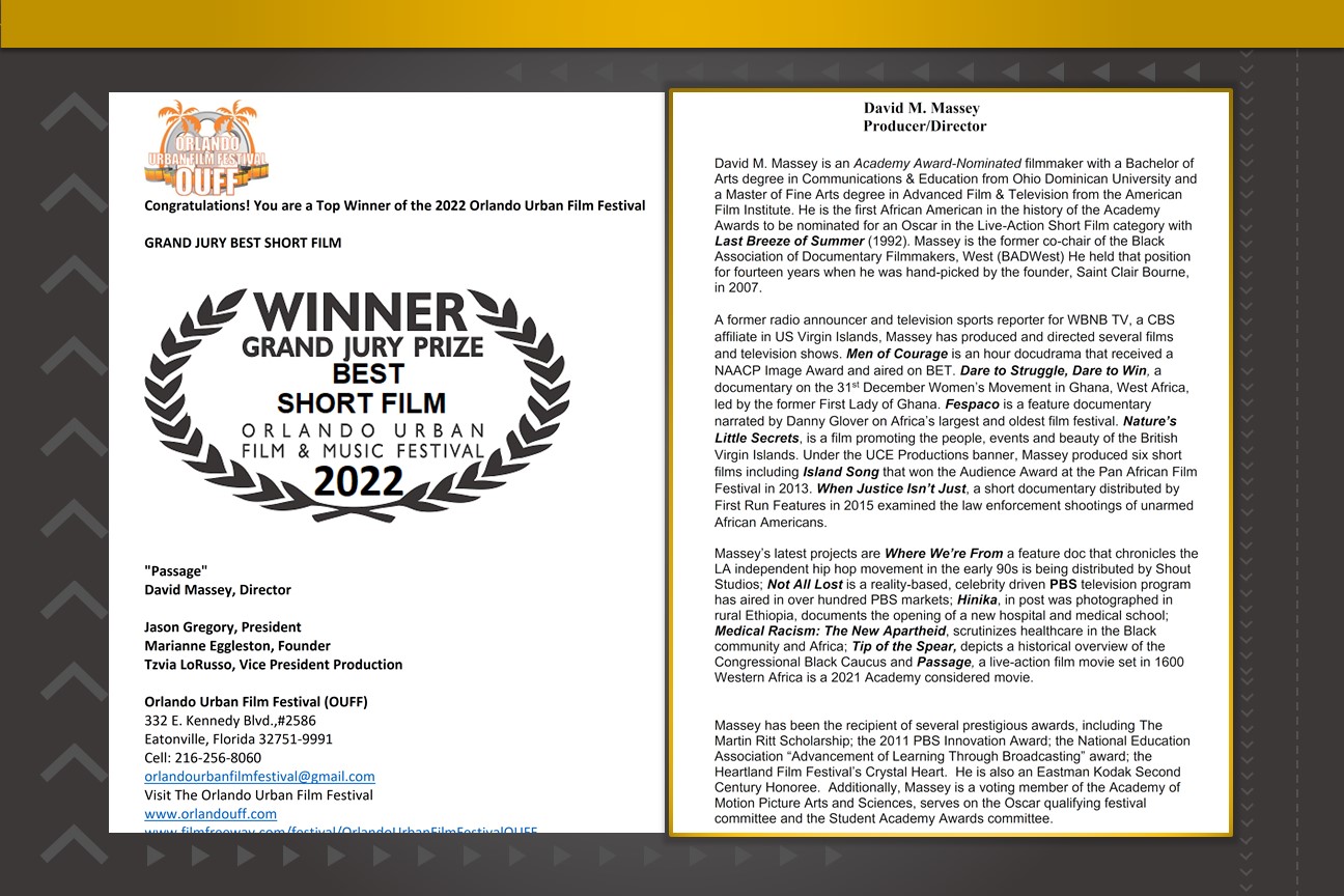 Massey’s latest projects are Where We’re From a feature doc that chronicles the LA independent hip hop movement in the early 90s is being distributed by Shout Studios; Not All Lost is a reality-based, celebrity driven PBS television program has aired in over hundred PBS markets; Hinika, in post was photographed in rural Ethiopia, documents the opening of a new hospital and medical school; Medical Racism: The New Apartheid, scrutinizes healthcare in the Black community and Africa; Tip of the Spear, depicts a historical overview of the Congressional Black Caucus and Passage, a live-action film set in 1600 Western Africa is a 2021 Academy considered movie.