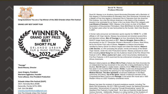 A former radio announcer and television sports reporter for WBNB TV, a CBS affiliate in US Virgin Islands, Massey has produced and directed several films and television shows. Men of Courage is an hour docudrama that received a NAACP Image Award and aired on BET. Dare to Struggle, Dare to Win, a documentary on the 31st December Women’s Movement in Ghana, West Africa, led by the former First Lady of Ghana. Fespaco is a feature documentary narrated by Danny Glover on Africa’s largest and oldest film festival. Nature’s Little Secrets, is a film promoting the people, events and beauty of the British Virgin Islands. Under the UCE Productions banner, Massey produced six short films including Island Song that won the Audience Award at the Pan African Film Festival in 2013. When Justice Isn’t Just, a short documentary distributed by First Run Features in 2015 examined the law enforcement shootings of unarmed African Americans.
